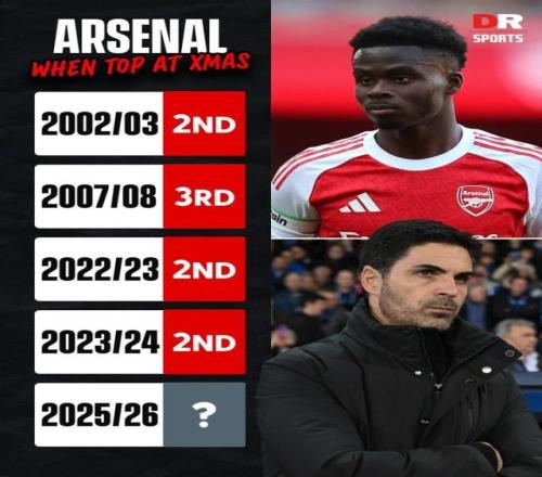 阿森納第5次成為英超圣誕冠軍 英超 12-21 12:25 阿森納1比0小勝阿爾特塔老東家埃弗頓,繼續(xù)領(lǐng)先曼城2分領(lǐng)跑英超積分榜。這是阿森納第5次以圣誕冠軍身份領(lǐng)跑,然而前4次都沒能最終奪冠(2002-03亞軍、2007-08季軍、2022-23亞軍、2023-24亞軍),其中前2次是被曼聯(lián)逆轉(zhuǎn)奪冠,后2次是被曼城逆轉(zhuǎn)奪冠。 若算上老英甲時代,槍手還有3次成為圣誕冠軍卻沒能最終捧起獎杯,分別是1951-52季軍、1986-87殿軍、1989-90殿軍。