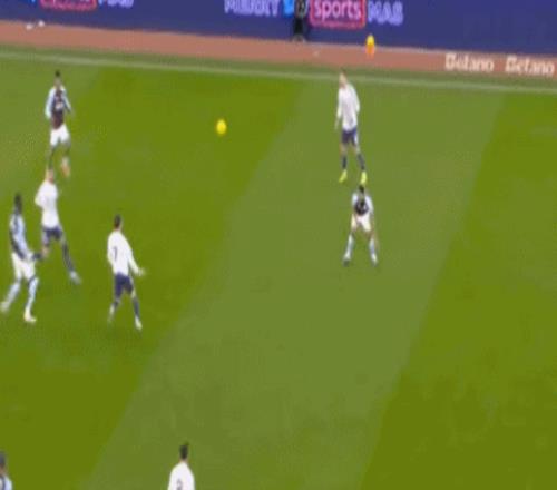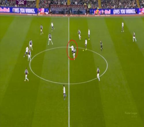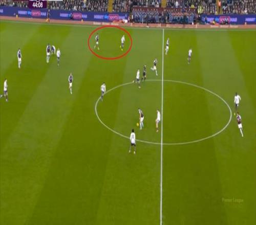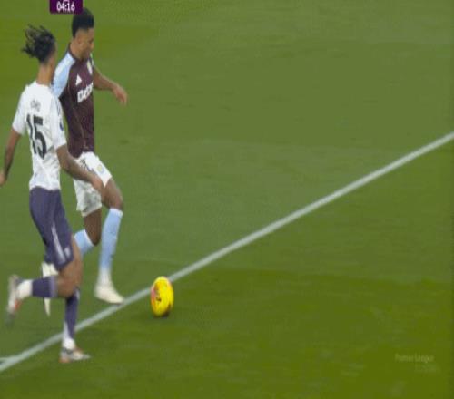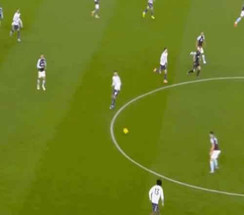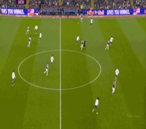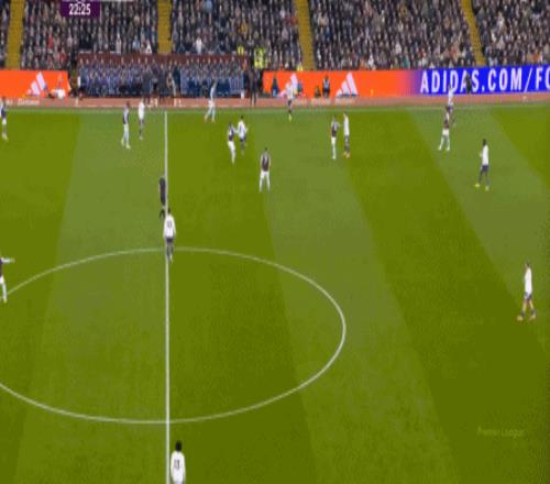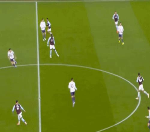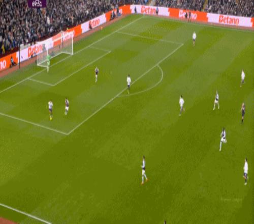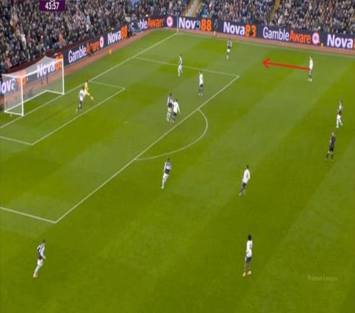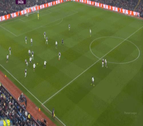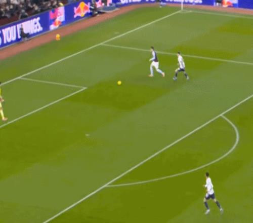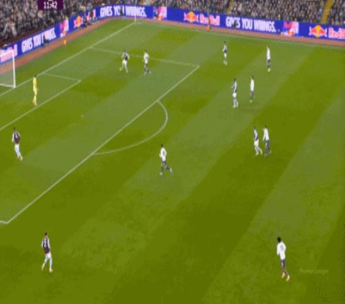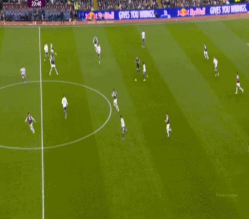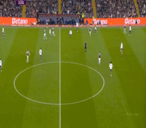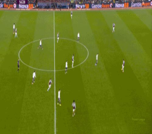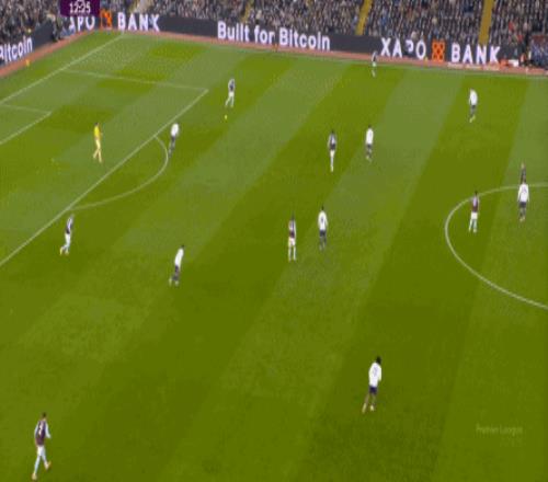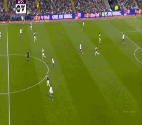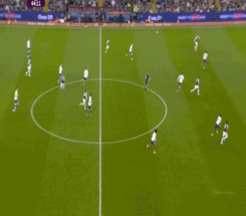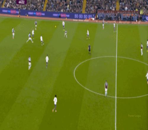 這里都是沒問題的,但到了前場(chǎng),芒特在背身的情況下被奧納納頂?shù)?,球?quán)轉(zhuǎn)換,阿斯頓維拉開始向前: