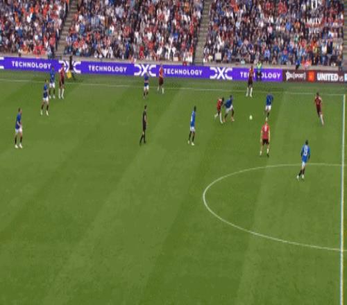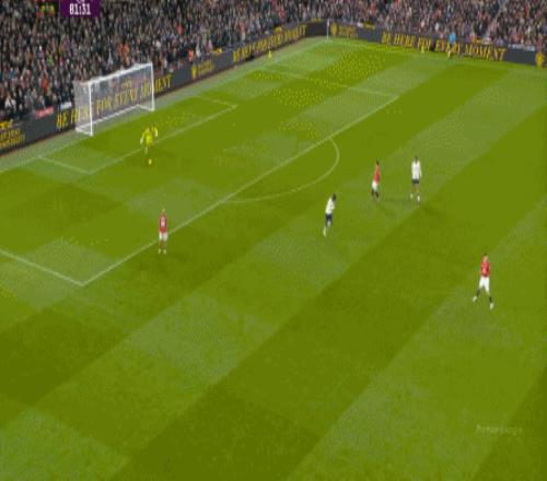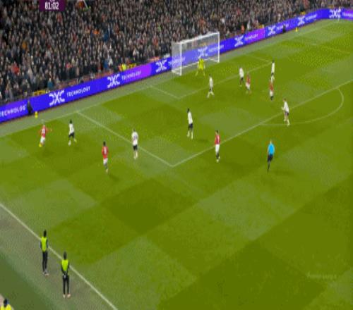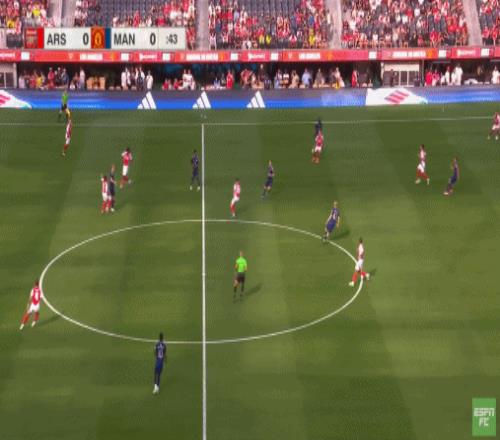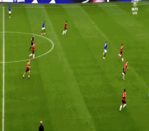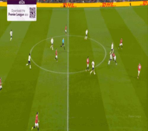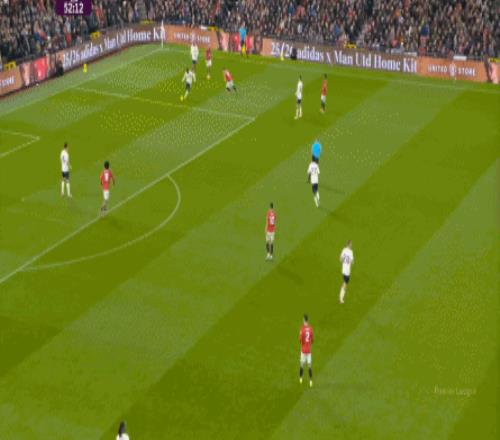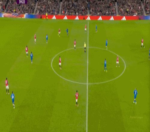 所以,這就從高位壓迫演變成了某種基于人盯人的防守思路,大家各管各的,也是現(xiàn)在很多教練的思路,比如加斯佩里尼、阿隆索、馬雷斯卡等人都是如此。 在這種非常類似于人盯人的防守體系里,由于沒有自由人的角色,這場(chǎng)也沒有具備自由人思路的特殊球員,所以就會(huì)看起來非常像沒有防守體系和邏輯。 在曼聯(lián),具備自由人思路的特殊球員其實(shí)是卡塞米羅,尤其是第一年的卡塞米羅,他會(huì)意識(shí)到自己需要在某一刻放棄自己的盯人職責(zé),轉(zhuǎn)而去解決更危急的防守情況,從而起到抓大放小的效果,比如協(xié)防隊(duì)友或者預(yù)先填補(bǔ)空當(dāng)。 然而,這場(chǎng)的曼聯(lián)剛好沒有卡塞米羅,而且也不是第一年的卡塞米羅了。 結(jié)果芒特沒有頂住奧納納,麥金可是靠自己的手臂動(dòng)作頂住了盧克-肖,然后直接斜長(zhǎng)傳找到了羅杰斯: