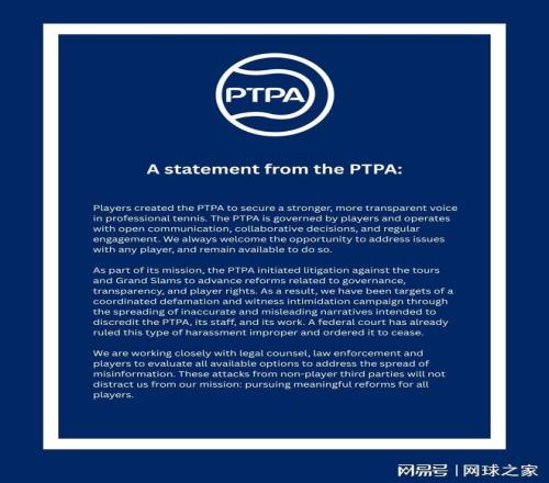 在德約科維奇發(fā)布聲明約五個多小時后,PTPA 也通過X發(fā)布了自己的聲明。盡管聲明中并未直接提及德約科維奇或回應(yīng)他的言論,但其中對圍繞該協(xié)會的輿論環(huán)境作出了令人擔(dān)憂的指控。PTPA表示,自其去年對ATP、WTA、ITF、ITIA 以及四大滿貫賽事提起訴訟以來,關(guān)于協(xié)會的不實信息正在被廣泛傳播。 聲明中寫道:“作為使命的一部分,PTPA對巡回賽組織和大滿貫賽事提起訴訟,以推動與治理、透明度和球員權(quán)益相關(guān)的改革。正因如此,我們成為了一場有組織的誹謗和證人恐嚇行動的目標(biāo),通過傳播不準(zhǔn)確、具有誤導(dǎo)性的敘事,意在抹黑PTPA、其員工以及我們的工作?!?/p>