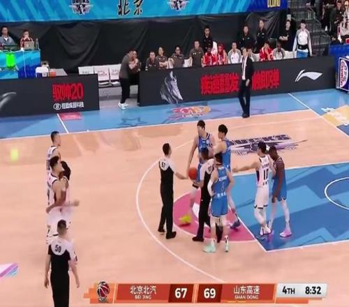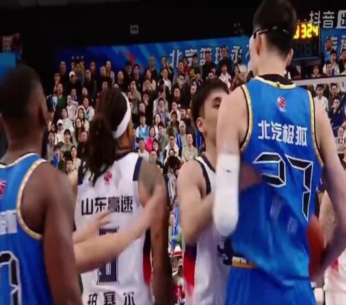 第四節(jié)賽場(chǎng)突發(fā)火藥味!比賽還剩下8分鐘34秒,山東外援珀賽爾殺入北京隊(duì)禁區(qū),一躍而起雙腳騰空隔扣了周琦,