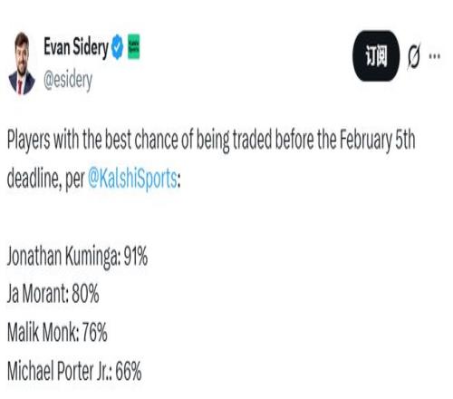 根據(jù)Kalshi Sports的數(shù)據(jù),庫明加的最新交易概率達到91%,高居榜首。他在本賽季早些時候幾乎完全跌出了勇士的輪換陣容,自12月19日后便再未登場。如果湖人最終將他列為引援目標,他們將寄望于全新的環(huán)境和更多的出場時間,能幫助庫明加在其NBA生涯第五個賽季的下半程找回狀態(tài)、迎來反彈。 |