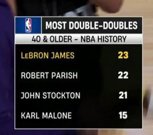 直播期間,轉(zhuǎn)播方曬出了NBA歷史上球員在40歲后兩雙次數(shù)排行榜,在這一榜單中,詹姆斯以23次位居榜首。