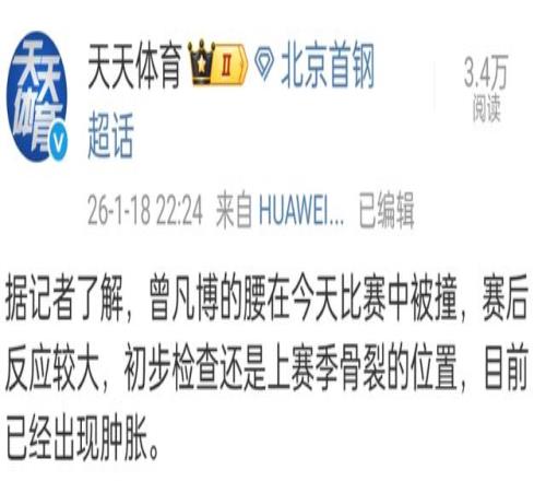 和寧波富邦的比賽,曾凡博和杰曼都出現(xiàn)了傷病情況,其中曾凡博的情況有些嚴重,他是腰部被撞了一下,賽后出現(xiàn)了腫脹的情況,檢查是上賽季出現(xiàn)骨裂的地方。北京首鋼稍后會安排曾凡博進行更詳細的檢查,但估計會休息一段時間。 還是希望曾凡博能夠徹底康復后再回歸球場,否則會影響他的職業(yè)生涯。