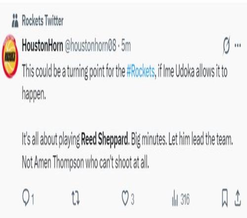 休媒:如果烏度卡能一直讓謝潑德登場(chǎng),那么就可能成為火箭本賽季的一個(gè)轉(zhuǎn)折點(diǎn),應(yīng)該給謝潑德大量登場(chǎng)時(shí)間,讓他去掌控球權(quán),而不是給阿門(mén)那種不會(huì)投籃的球員核心席位。
