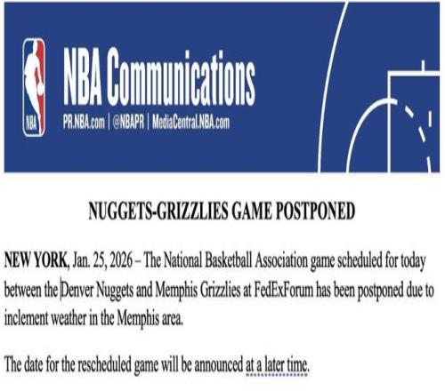 今天,NBA官方宣布, 獨(dú)行俠對陣雄鹿,掘金對陣灰熊,因當(dāng)?shù)貝毫犹鞖?,比賽取消延期?/p>