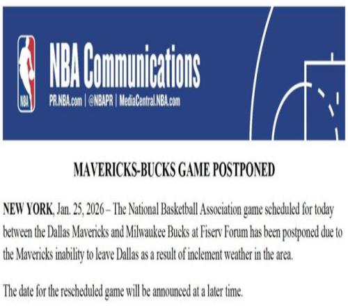 獨(dú)行俠對雄鹿,是因?yàn)?span search-type="3" search-href="newsapp://nc/search?entry=articleKeyword&word=%E8%BE%BE%E6%8B%89%E6%96%AF">達(dá)拉斯當(dāng)?shù)貝毫犹鞖?,遭遇?qiáng)降雪、凍雨及低溫(最低達(dá)零下21度),球隊(duì)在昨天賽后連采訪都取消了,就為了馬不停蹄提前奔赴機(jī)場趕下一場比賽,結(jié)果人算不如天算,球隊(duì)雖提前抵達(dá)機(jī)場,還是因?yàn)樘鞖庠驘o法起飛,全員被迫返回市區(qū)滯留,無法按時(shí)抵達(dá)密爾沃基,聯(lián)盟宣布比賽推遲。