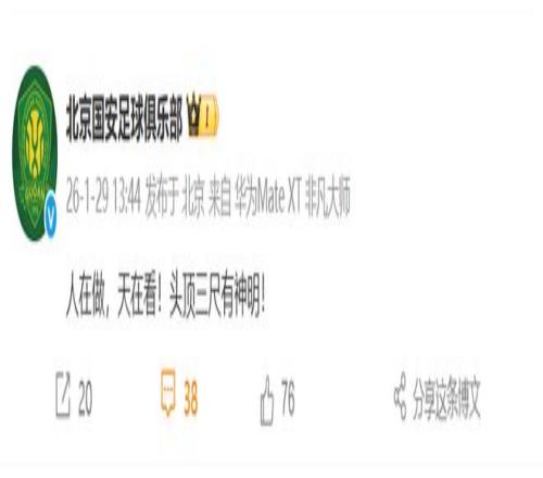 1月29日中午,北京國(guó)安足球俱樂部發(fā)布微博:人在做,天在看!頭頂三尺有神明! 編輯 | 馬媛 來源 | 北京國(guó)安足球俱樂部官方微博 |