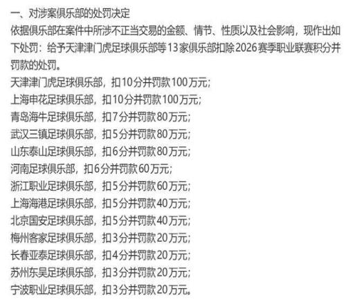 此次處罰的俱樂部,覆蓋9家中超俱樂部和4家中甲俱樂部,懲戒力度呈現(xiàn)鮮明梯度,參與過2021及之前賽季中超聯(lián)賽的現(xiàn)存俱樂部全部被罰! 上海申花與天津津門虎因情節(jié)嚴重,被頂格扣除10分并罰款100萬元;青島海牛、山東泰山等俱樂部按涉事程度,分別面臨7至3分的罰分及20萬至80萬元的罰款。