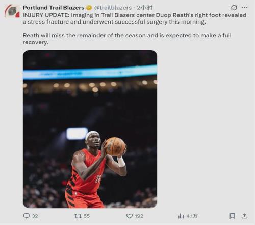 北京時間1月30日上午,開拓者官方宣布:球隊中鋒杜普-里斯右腳應力性骨折,今天順利完成手術。里斯將缺席本賽季剩余比賽,2025-26賽季正式報銷。本賽季至少有兩個NBA中鋒因應力性骨折而報銷,另一個是獨行俠的萊夫利。
