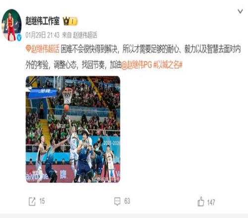 賽后,趙繼偉工作室發(fā)文喊話遼寧全隊:困難不會很快得到解決,所以才需要足夠的耐心、毅力以及智慧去面對內(nèi)外的考驗,調(diào)整心態(tài),找回節(jié)奏,加油。本場比賽,趙繼偉狀態(tài)低迷,僅得到8分4板6助,正負值-18全隊最低。