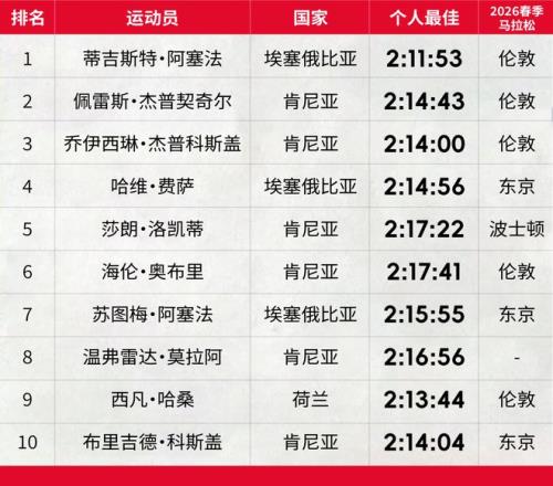 如果忽略魯斯·切普恩杰蒂奇2:09:56的世界紀錄(該紀錄是在她藥檢檢測出禁用掩蔽劑陽性前五個月創(chuàng)造的),2026年倫敦馬拉松匯聚了歷史上最快的五位女性中的四位:排名第一的阿塞法(個人最佳2:11:53),第二的哈桑(個人最佳2:13:44),第三的杰普科斯蓋(個人最佳2:14:00),第五的杰普契奇爾(個人最佳2:14:43)。選擇參加?xùn)|京馬拉松的布里吉德·科斯蓋是前五名中唯一缺席的選手。 總的來說,2026年倫敦馬拉松的陣容包括了2025年八大雅培世界馬拉松大滿貫賽事中四站的衛(wèi)冕冠軍——倫敦(阿塞法)、悉尼(哈桑)、世錦賽(杰普契奇爾)和紐約(奧布里),以及瓦倫西亞冠軍(杰普科斯蓋)。 缺席的衛(wèi)冕大滿貫冠軍是波士頓冠軍莎朗·洛凱蒂,她將參加波士頓,以及東京衛(wèi)冕冠軍蘇圖梅·阿塞法·凱貝德、柏林衛(wèi)冕冠軍羅斯瑪麗·萬吉魯和芝加哥衛(wèi)冕冠軍哈維·費薩,她們將參加?xùn)|京馬拉松。